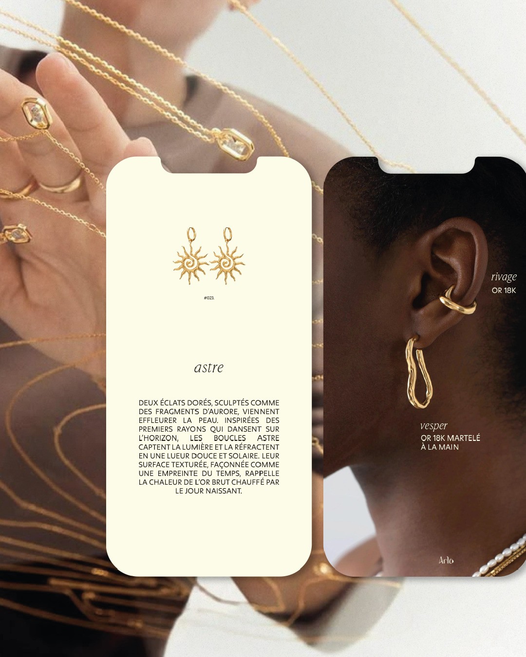Avec son design minimaliste et ses textures organiques, Arlo traduit une esthétique subtile et raffinée, où chaque détail est pensé pour évoquer la lumière, la matière et l’artisanat. L’association de lignes irrégulières, d’une palette minérale et d’une typographie épurée crée une identité à la fois contemporaine et intemporelle.